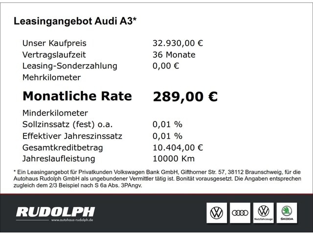 Voor zakelijke klanten bieden wij optioneel een financial lease oplossing en voor particuliere klanten een persoonlijke lening. Met onderstaande module kunt u uw maandbedrag berekenen voor het financieren van bovenstaande Audi A3.