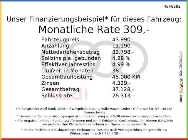 Voor zakelijke klanten bieden wij optioneel een financial lease oplossing en voor particuliere klanten een persoonlijke lening. Met onderstaande module kunt u uw maandbedrag berekenen voor het financieren van bovenstaande Audi A4 Allroad.