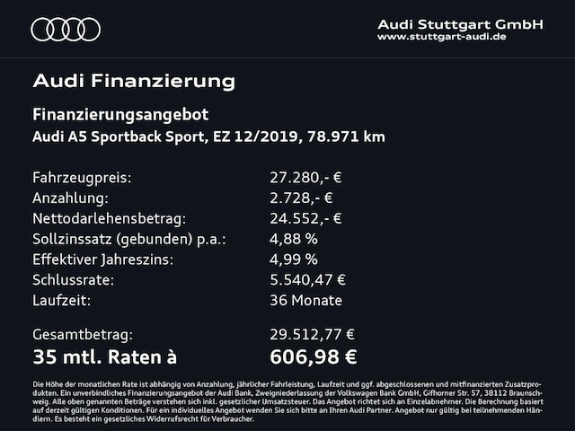 Voor zakelijke klanten bieden wij optioneel een financial lease oplossing en voor particuliere klanten een persoonlijke lening. Met onderstaande module kunt u uw maandbedrag berekenen voor het financieren van bovenstaande Audi A5.