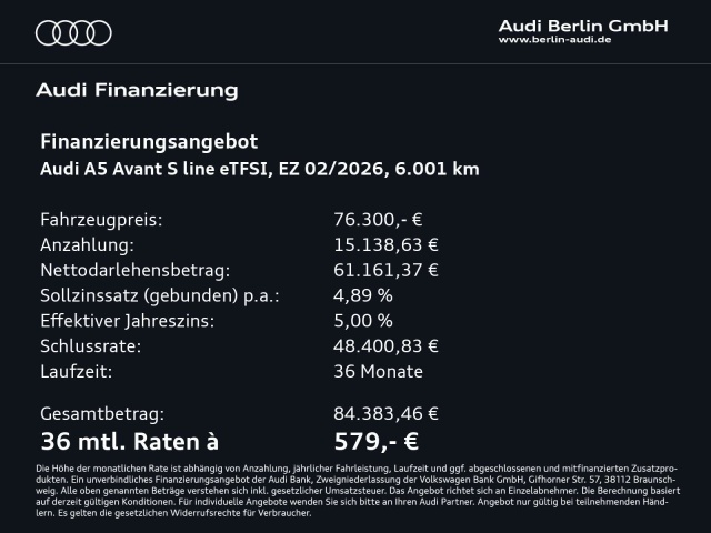 Voor zakelijke klanten bieden wij optioneel een financial lease oplossing en voor particuliere klanten een persoonlijke lening. Met onderstaande module kunt u uw maandbedrag berekenen voor het financieren van bovenstaande Audi A5.