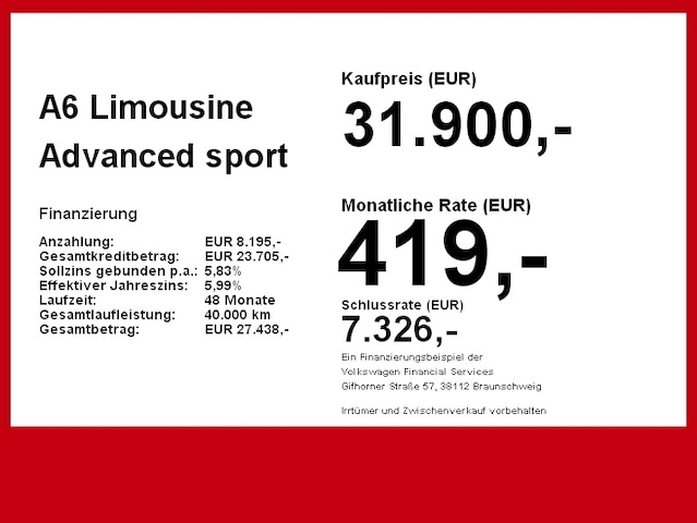 Voor zakelijke klanten bieden wij optioneel een financial lease oplossing en voor particuliere klanten een persoonlijke lening. Met onderstaande module kunt u uw maandbedrag berekenen voor het financieren van bovenstaande Audi A6.