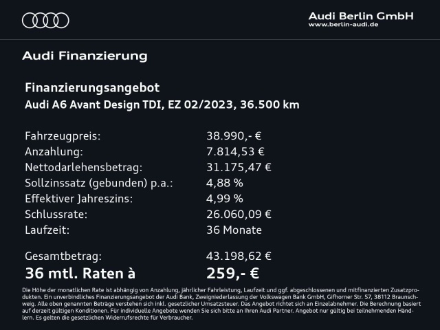 Voor zakelijke klanten bieden wij optioneel een financial lease oplossing en voor particuliere klanten een persoonlijke lening. Met onderstaande module kunt u uw maandbedrag berekenen voor het financieren van bovenstaande Audi A6.