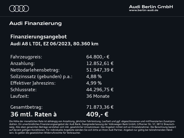 Voor zakelijke klanten bieden wij optioneel een financial lease oplossing en voor particuliere klanten een persoonlijke lening. Met onderstaande module kunt u uw maandbedrag berekenen voor het financieren van bovenstaande Audi A8.