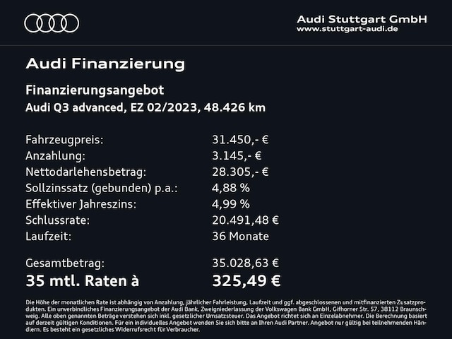 Voor zakelijke klanten bieden wij optioneel een financial lease oplossing en voor particuliere klanten een persoonlijke lening. Met onderstaande module kunt u uw maandbedrag berekenen voor het financieren van bovenstaande Audi Q3.