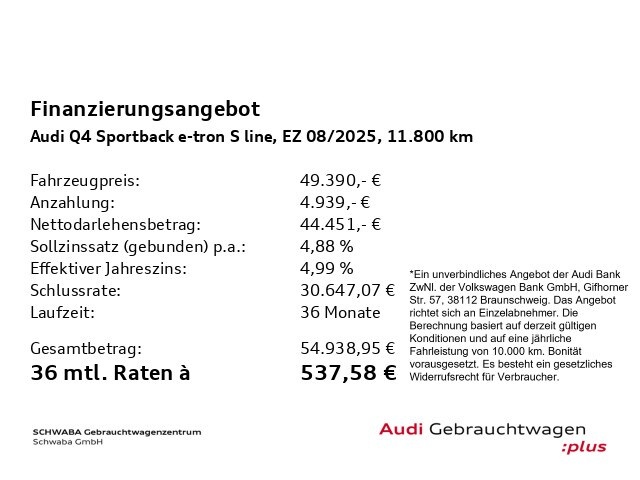 Voor zakelijke klanten bieden wij optioneel een financial lease oplossing en voor particuliere klanten een persoonlijke lening. Met onderstaande module kunt u uw maandbedrag berekenen voor het financieren van bovenstaande Audi Q4.