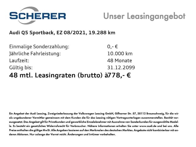 Voor zakelijke klanten bieden wij optioneel een financial lease oplossing en voor particuliere klanten een persoonlijke lening. Met onderstaande module kunt u uw maandbedrag berekenen voor het financieren van bovenstaande Audi Q5.
