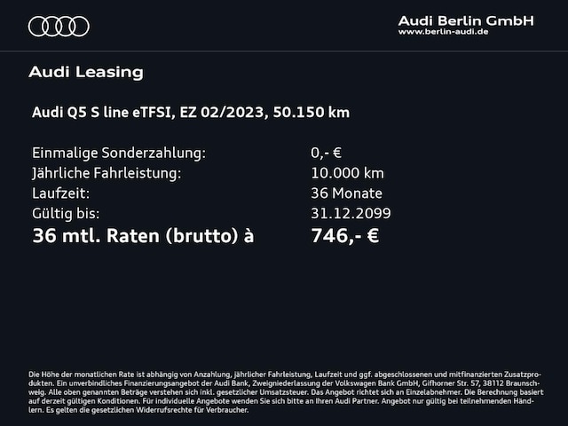 Voor zakelijke klanten bieden wij optioneel een financial lease oplossing en voor particuliere klanten een persoonlijke lening. Met onderstaande module kunt u uw maandbedrag berekenen voor het financieren van bovenstaande Audi Q5.