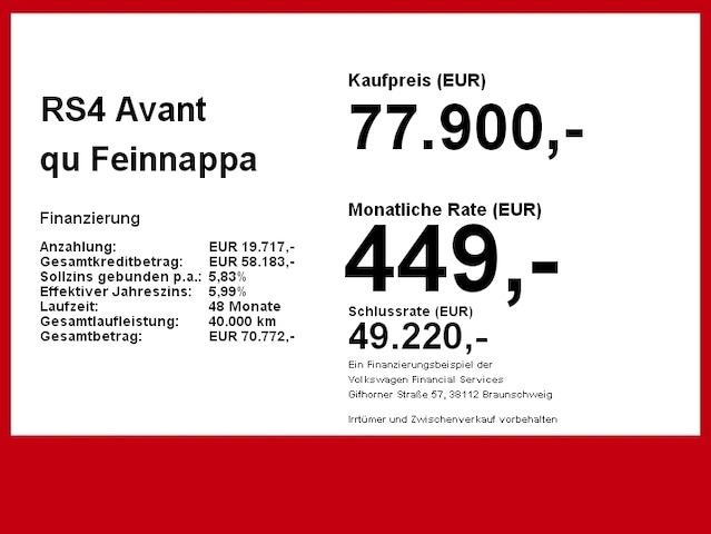 Voor zakelijke klanten bieden wij optioneel een financial lease oplossing en voor particuliere klanten een persoonlijke lening. Met onderstaande module kunt u uw maandbedrag berekenen voor het financieren van bovenstaande Audi RS4.