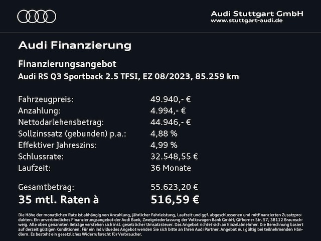 Voor zakelijke klanten bieden wij optioneel een financial lease oplossing en voor particuliere klanten een persoonlijke lening. Met onderstaande module kunt u uw maandbedrag berekenen voor het financieren van bovenstaande Audi RSQ3.