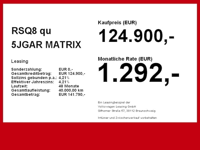 Deze Audi RSQ8 staat te koop in Duitsland bij een officiële Audi dealer. Wanneer u gebruik maakt van onze auto import service dan regelen wij het aankoopproces samen met u. U tekent en betaalt zelf. U bent in de meeste gevallen ook juridisch de koper. Dat kan belangrijk zijn voor garantie, rechtspositie en de lagere Duitse btw.