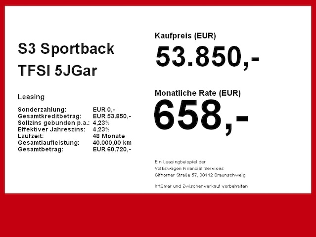 Voor zakelijke klanten bieden wij optioneel een financial lease oplossing en voor particuliere klanten een persoonlijke lening. Met onderstaande module kunt u uw maandbedrag berekenen voor het financieren van bovenstaande Audi S3.