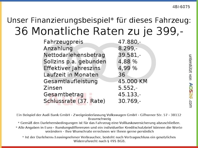 Voor zakelijke klanten bieden wij optioneel een financial lease oplossing en voor particuliere klanten een persoonlijke lening. Met onderstaande module kunt u uw maandbedrag berekenen voor het financieren van bovenstaande Audi S4.