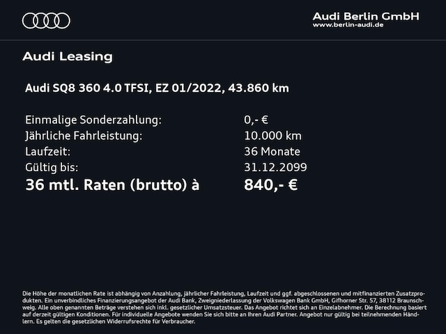 Voor zakelijke klanten bieden wij optioneel een financial lease oplossing en voor particuliere klanten een persoonlijke lening. Met onderstaande module kunt u uw maandbedrag berekenen voor het financieren van bovenstaande Audi SQ8.