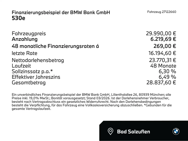 Voor zakelijke klanten bieden wij optioneel een financial lease oplossing en voor particuliere klanten een persoonlijke lening. Met onderstaande module kunt u uw maandbedrag berekenen voor het financieren van bovenstaande BMW 530.
