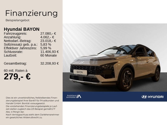 Voor zakelijke klanten bieden wij optioneel een financial lease oplossing en voor particuliere klanten een persoonlijke lening. Met onderstaande module kunt u uw maandbedrag berekenen voor het financieren van bovenstaande Hyundai Bayon.