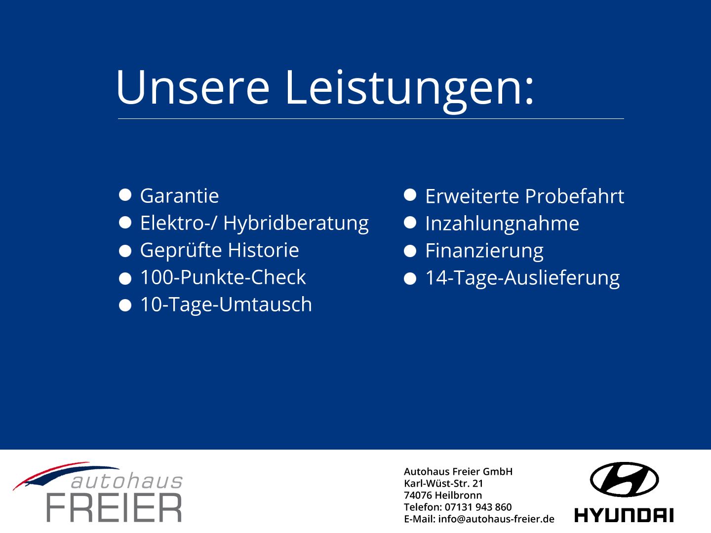Om voornoemde redenen kunt u doorgaans het beste zelf de auto bij de Duitse Hyundai dealer aanschaffen ( 1 ). Wanneer u gebruikt maakt van ons Premium of Premium + pakket zullen wij dit aankoopproces volledig begeleiden en faciliteren.