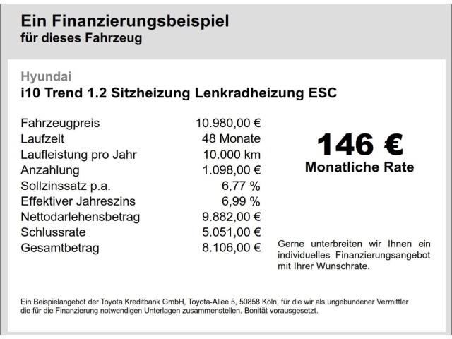 Voor zakelijke klanten bieden wij optioneel een financial lease oplossing en voor particuliere klanten een persoonlijke lening. Met onderstaande module kunt u uw maandbedrag berekenen voor het financieren van bovenstaande Hyundai i10.