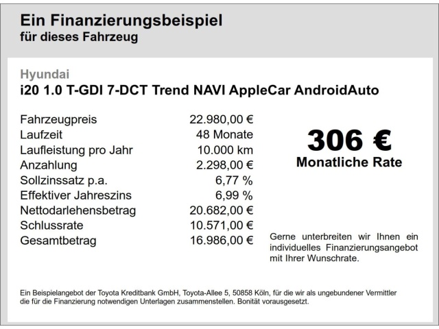 Voor zakelijke klanten bieden wij optioneel een financial lease oplossing en voor particuliere klanten een persoonlijke lening. Met onderstaande module kunt u uw maandbedrag berekenen voor het financieren van bovenstaande Hyundai i20.