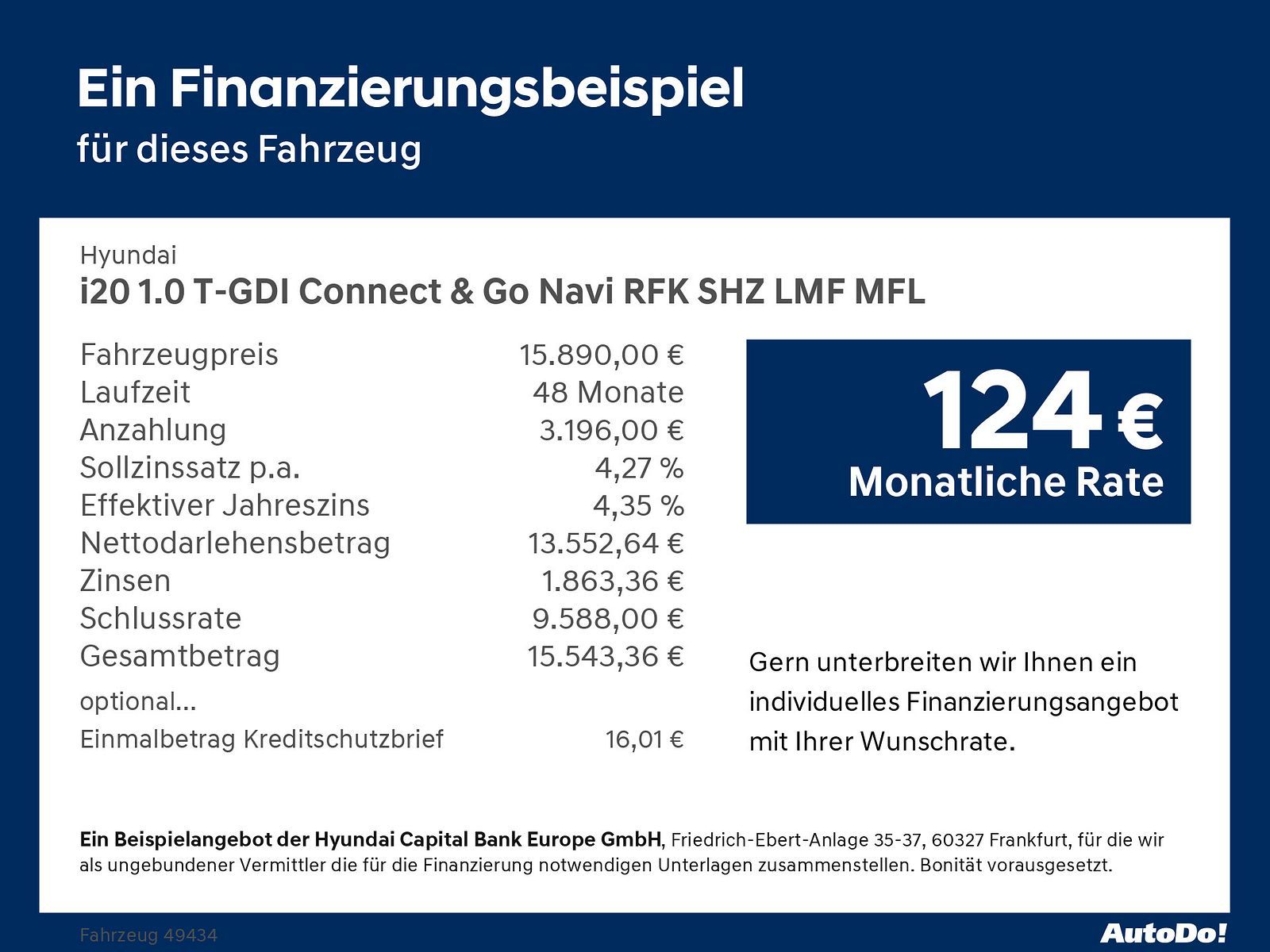 Voor zakelijke klanten bieden wij optioneel een financial lease oplossing en voor particuliere klanten een persoonlijke lening. Met onderstaande module kunt u uw maandbedrag berekenen voor het financieren van bovenstaande Hyundai i20.