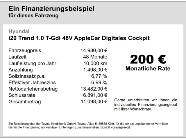 Voor zakelijke klanten bieden wij optioneel een financial lease oplossing en voor particuliere klanten een persoonlijke lening. Met onderstaande module kunt u uw maandbedrag berekenen voor het financieren van bovenstaande Hyundai i20.