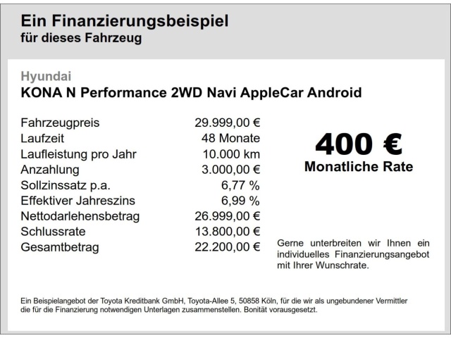 Voor zakelijke klanten bieden wij optioneel een financial lease oplossing en voor particuliere klanten een persoonlijke lening. Met onderstaande module kunt u uw maandbedrag berekenen voor het financieren van bovenstaande Hyundai Kona.