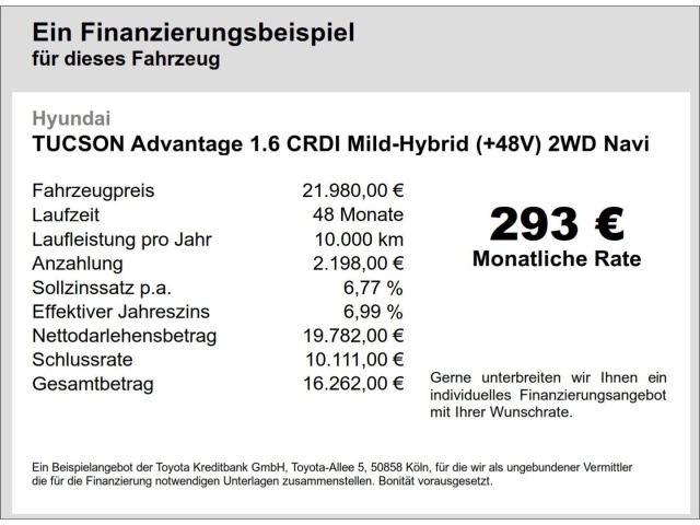 Voor zakelijke klanten bieden wij optioneel een financial lease oplossing en voor particuliere klanten een persoonlijke lening. Met onderstaande module kunt u uw maandbedrag berekenen voor het financieren van bovenstaande Hyundai Tucson.