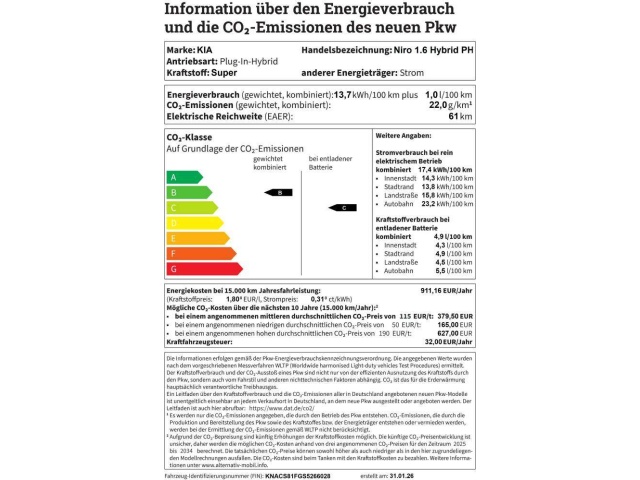 In de Duitse advertentie van deze Kia Niro staat een CO2-uitstoot vermeld van 21 gram per km. Op basis daarvan hebben wij geautomatiseerd een indicatief rest-BPM bedrag van € 507 berekend op basis van de afschrijvingstabel van de Belastingdienst. Een handmatige BPM berekening o.b.v. een waardebepaling leidt voor jonge auto's vaak tot een lager rest-BPM bedrag. Vraag hiertoe een offerte aan, vaak kunnen we daar een besparing voor u realiseren. Om hiervoor een fiscaal akkoord te krijgen zal de BPM aangifte worden aangevuld met een waardebepaling taxatierapport. Wij rekenen een fee voor onze bemiddeling hierin. Uiteraard alleen wanneer dit rendabel is.