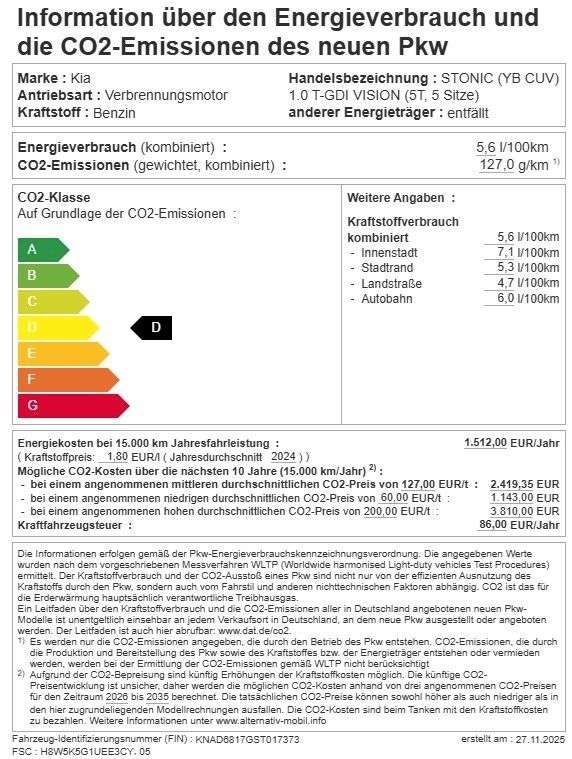 In de Duitse advertentie van deze Kia Stonic staat een CO2-uitstoot vermeld van 127 gram per km. Op basis daarvan hebben wij geautomatiseerd een indicatief rest-BPM bedrag van € 7.061 berekend op basis van de afschrijvingstabel van de Belastingdienst. Een handmatige BPM berekening o.b.v. een waardebepaling leidt voor jonge auto's vaak tot een lager rest-BPM bedrag. Vraag hiertoe een offerte aan, vaak kunnen we daar een besparing voor u realiseren. Om hiervoor een fiscaal akkoord te krijgen zal de BPM aangifte worden aangevuld met een waardebepaling taxatierapport. Wij rekenen een fee voor onze bemiddeling hierin. Uiteraard alleen wanneer dit rendabel is.