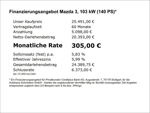 Voor zakelijke klanten bieden wij optioneel een financial lease oplossing en voor particuliere klanten een persoonlijke lening. Met onderstaande module kunt u uw maandbedrag berekenen voor het financieren van bovenstaande Mazda 3.
