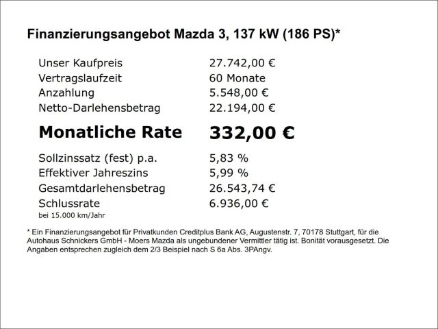 Voor zakelijke klanten bieden wij optioneel een financial lease oplossing en voor particuliere klanten een persoonlijke lening. Met onderstaande module kunt u uw maandbedrag berekenen voor het financieren van bovenstaande Mazda 3.