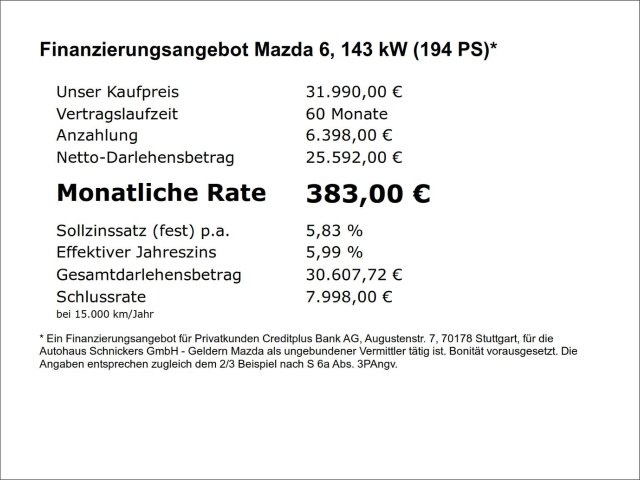 Voor zakelijke klanten bieden wij optioneel een financial lease oplossing en voor particuliere klanten een persoonlijke lening. Met onderstaande module kunt u uw maandbedrag berekenen voor het financieren van bovenstaande Mazda 6.