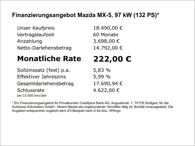Voor zakelijke klanten bieden wij optioneel een financial lease oplossing en voor particuliere klanten een persoonlijke lening. Met onderstaande module kunt u uw maandbedrag berekenen voor het financieren van bovenstaande Mazda MX-5.