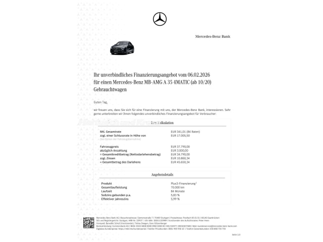 Voor zakelijke klanten bieden wij optioneel een financial lease oplossing en voor particuliere klanten een persoonlijke lening. Met onderstaande module kunt u uw maandbedrag berekenen voor het financieren van bovenstaande Mercedes-Benz A 35.