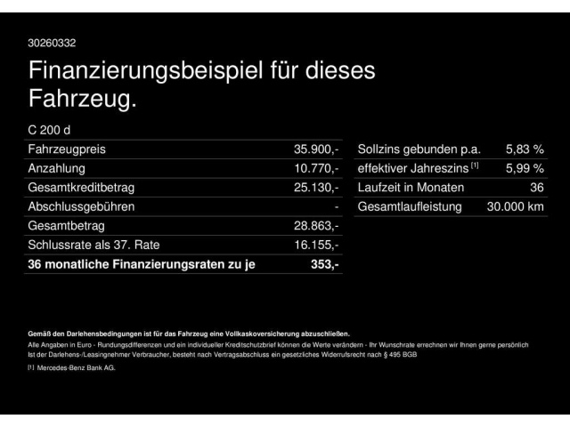 Voor zakelijke klanten bieden wij optioneel een financial lease oplossing en voor particuliere klanten een persoonlijke lening. Met onderstaande module kunt u uw maandbedrag berekenen voor het financieren van bovenstaande Mercedes-Benz C 200.