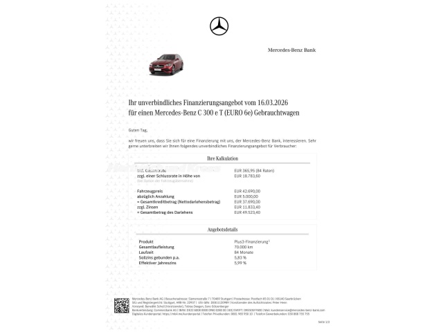 Voor zakelijke klanten bieden wij optioneel een financial lease oplossing en voor particuliere klanten een persoonlijke lening. Met onderstaande module kunt u uw maandbedrag berekenen voor het financieren van bovenstaande Mercedes-Benz C 300.