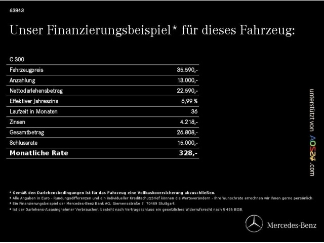 Voor zakelijke klanten bieden wij optioneel een financial lease oplossing en voor particuliere klanten een persoonlijke lening. Met onderstaande module kunt u uw maandbedrag berekenen voor het financieren van bovenstaande Mercedes-Benz C 300.