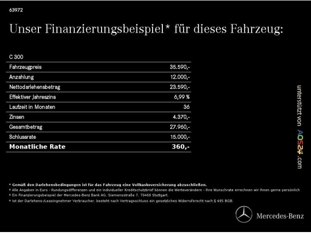 Voor zakelijke klanten bieden wij optioneel een financial lease oplossing en voor particuliere klanten een persoonlijke lening. Met onderstaande module kunt u uw maandbedrag berekenen voor het financieren van bovenstaande Mercedes-Benz C 300.