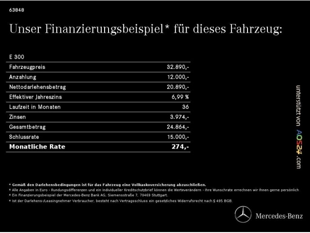Voor zakelijke klanten bieden wij optioneel een financial lease oplossing en voor particuliere klanten een persoonlijke lening. Met onderstaande module kunt u uw maandbedrag berekenen voor het financieren van bovenstaande Mercedes-Benz E 300.