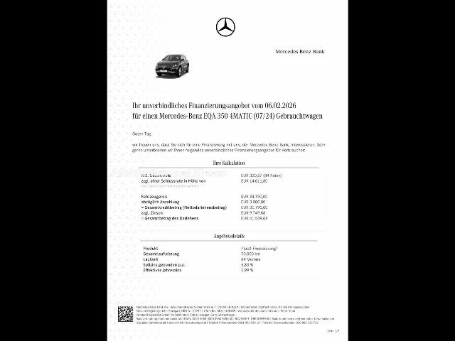 Voor zakelijke klanten bieden wij optioneel een financial lease oplossing en voor particuliere klanten een persoonlijke lening. Met onderstaande module kunt u uw maandbedrag berekenen voor het financieren van bovenstaande Mercedes-Benz EQA 350.