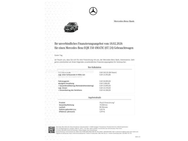 Voor zakelijke klanten bieden wij optioneel een financial lease oplossing en voor particuliere klanten een persoonlijke lening. Met onderstaande module kunt u uw maandbedrag berekenen voor het financieren van bovenstaande Mercedes-Benz EQB.