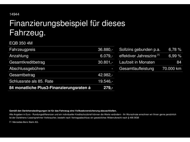 Voor zakelijke klanten bieden wij optioneel een financial lease oplossing en voor particuliere klanten een persoonlijke lening. Met onderstaande module kunt u uw maandbedrag berekenen voor het financieren van bovenstaande Mercedes-Benz EQB.