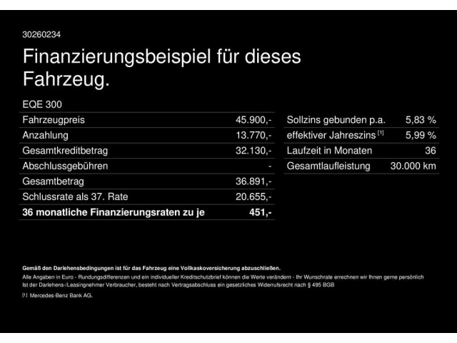 Voor zakelijke klanten bieden wij optioneel een financial lease oplossing en voor particuliere klanten een persoonlijke lening. Met onderstaande module kunt u uw maandbedrag berekenen voor het financieren van bovenstaande Mercedes-Benz EQE.