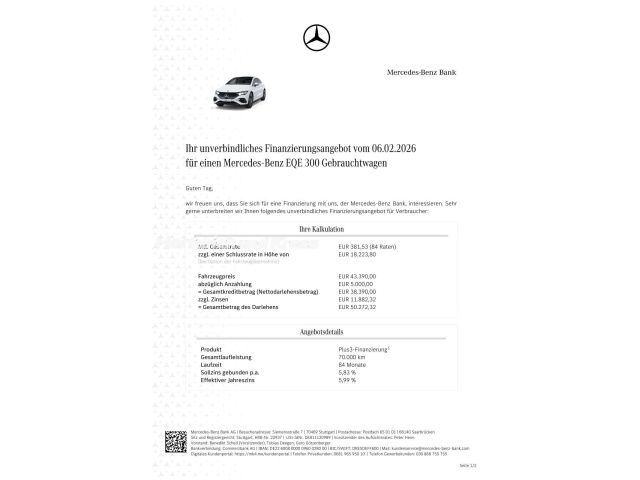 Voor zakelijke klanten bieden wij optioneel een financial lease oplossing en voor particuliere klanten een persoonlijke lening. Met onderstaande module kunt u uw maandbedrag berekenen voor het financieren van bovenstaande Mercedes-Benz EQE.