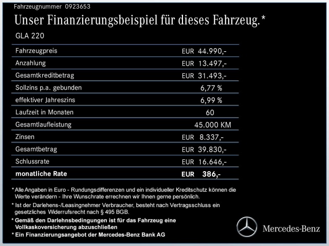 Voor zakelijke klanten bieden wij optioneel een financial lease oplossing en voor particuliere klanten een persoonlijke lening. Met onderstaande module kunt u uw maandbedrag berekenen voor het financieren van bovenstaande Mercedes-Benz GLA 220.