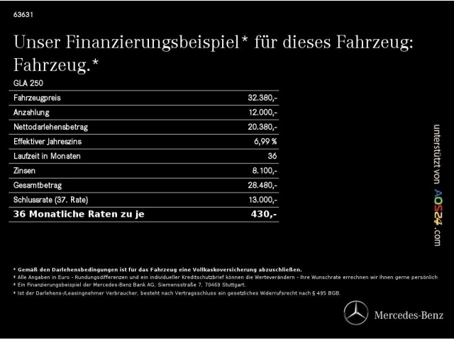 Voor zakelijke klanten bieden wij optioneel een financial lease oplossing en voor particuliere klanten een persoonlijke lening. Met onderstaande module kunt u uw maandbedrag berekenen voor het financieren van bovenstaande Mercedes-Benz GLA 250.