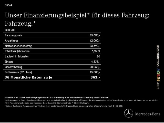 Voor zakelijke klanten bieden wij optioneel een financial lease oplossing en voor particuliere klanten een persoonlijke lening. Met onderstaande module kunt u uw maandbedrag berekenen voor het financieren van bovenstaande Mercedes-Benz GLB 200.