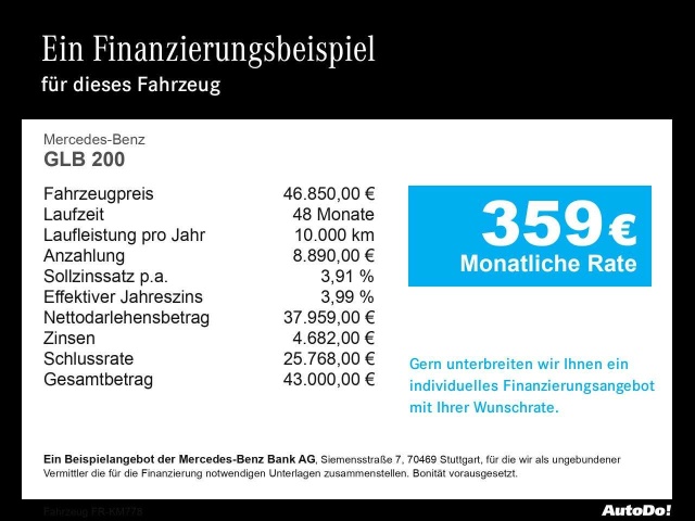 Voor zakelijke klanten bieden wij optioneel een financial lease oplossing en voor particuliere klanten een persoonlijke lening. Met onderstaande module kunt u uw maandbedrag berekenen voor het financieren van bovenstaande Mercedes-Benz GLB 200.