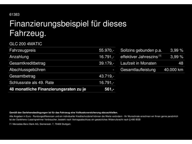 Voor zakelijke klanten bieden wij optioneel een financial lease oplossing en voor particuliere klanten een persoonlijke lening. Met onderstaande module kunt u uw maandbedrag berekenen voor het financieren van bovenstaande Mercedes-Benz GLC 200.