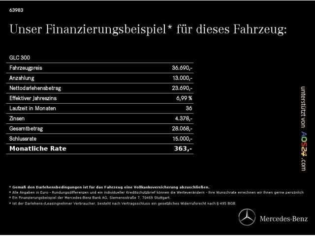 Voor zakelijke klanten bieden wij optioneel een financial lease oplossing en voor particuliere klanten een persoonlijke lening. Met onderstaande module kunt u uw maandbedrag berekenen voor het financieren van bovenstaande Mercedes-Benz GLC 300.
