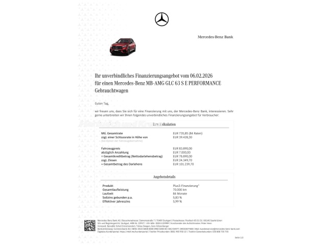 Voor zakelijke klanten bieden wij optioneel een financial lease oplossing en voor particuliere klanten een persoonlijke lening. Met onderstaande module kunt u uw maandbedrag berekenen voor het financieren van bovenstaande Mercedes-Benz GLC 63.
